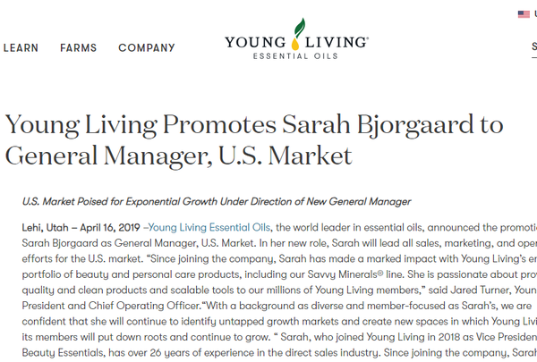 Lehi, Utah – April 16, 2019 –Young Living Essential Oils, the world leader in essential oils, announced the promotion of Sarah Bjorgaard as General Manager, U.S. Market. In her new role, Sarah will lead all sales, marketing, and operations efforts for the U.S. market. “Since joining the company, Sarah has made a marked impact with Young Living’s entire portfolio of beauty and personal care products, including our S